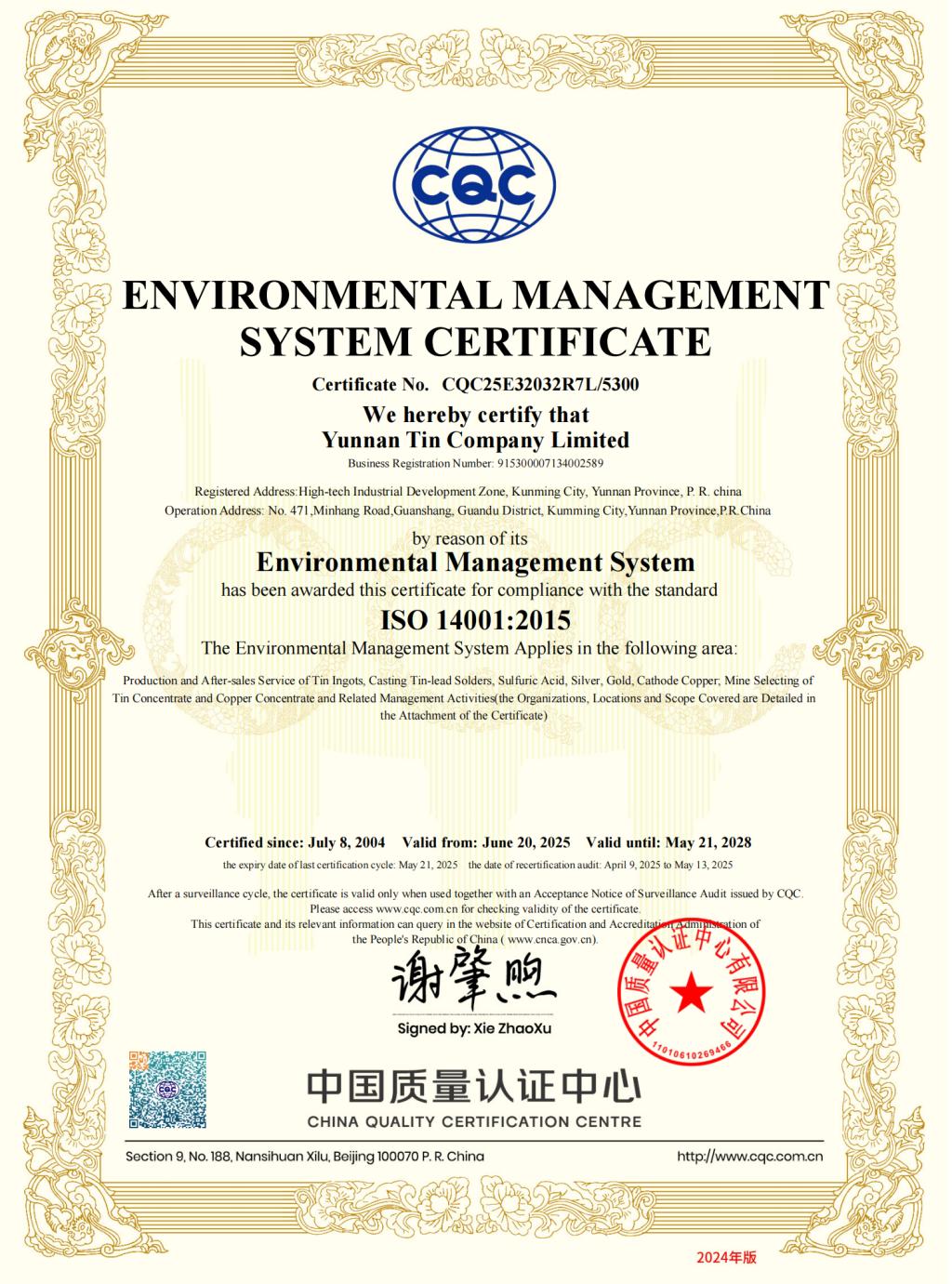 CQC环境管理体系认证证书(英文)