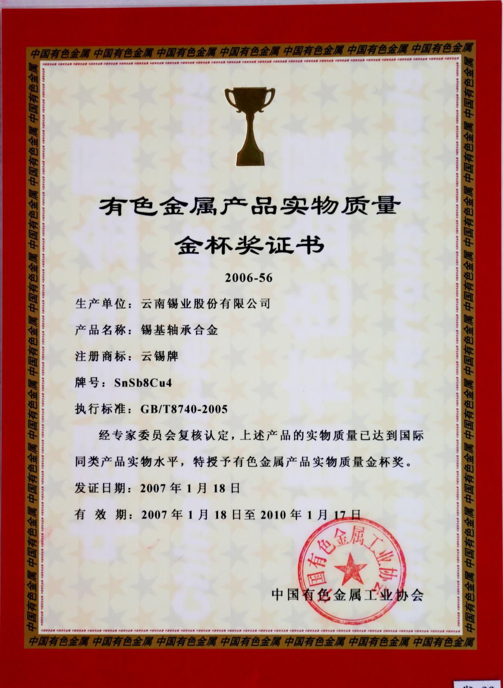 云锡牌锡基轴承合金获有色金属实物质量金杯奖