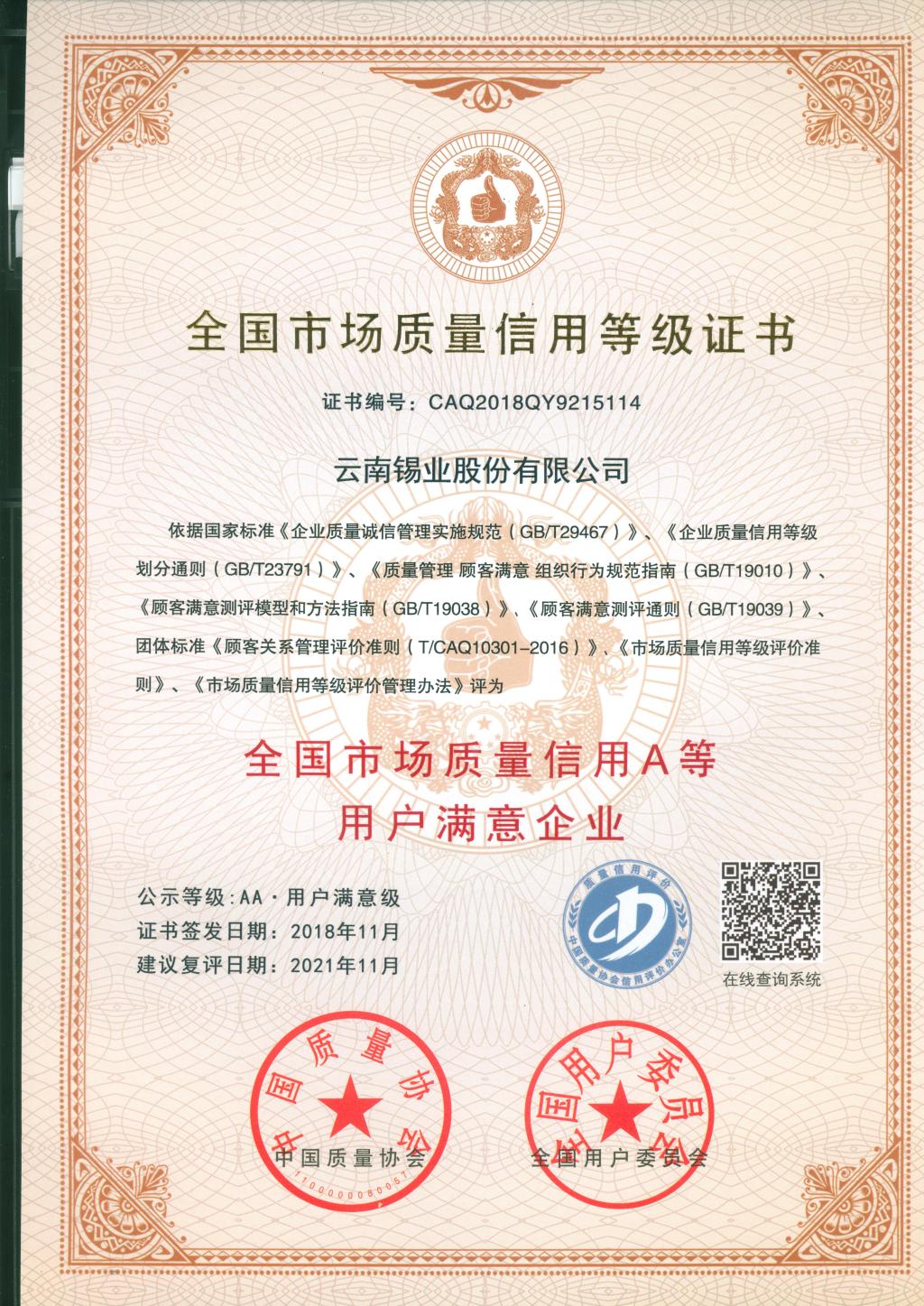 2018质量信用等级证书AA