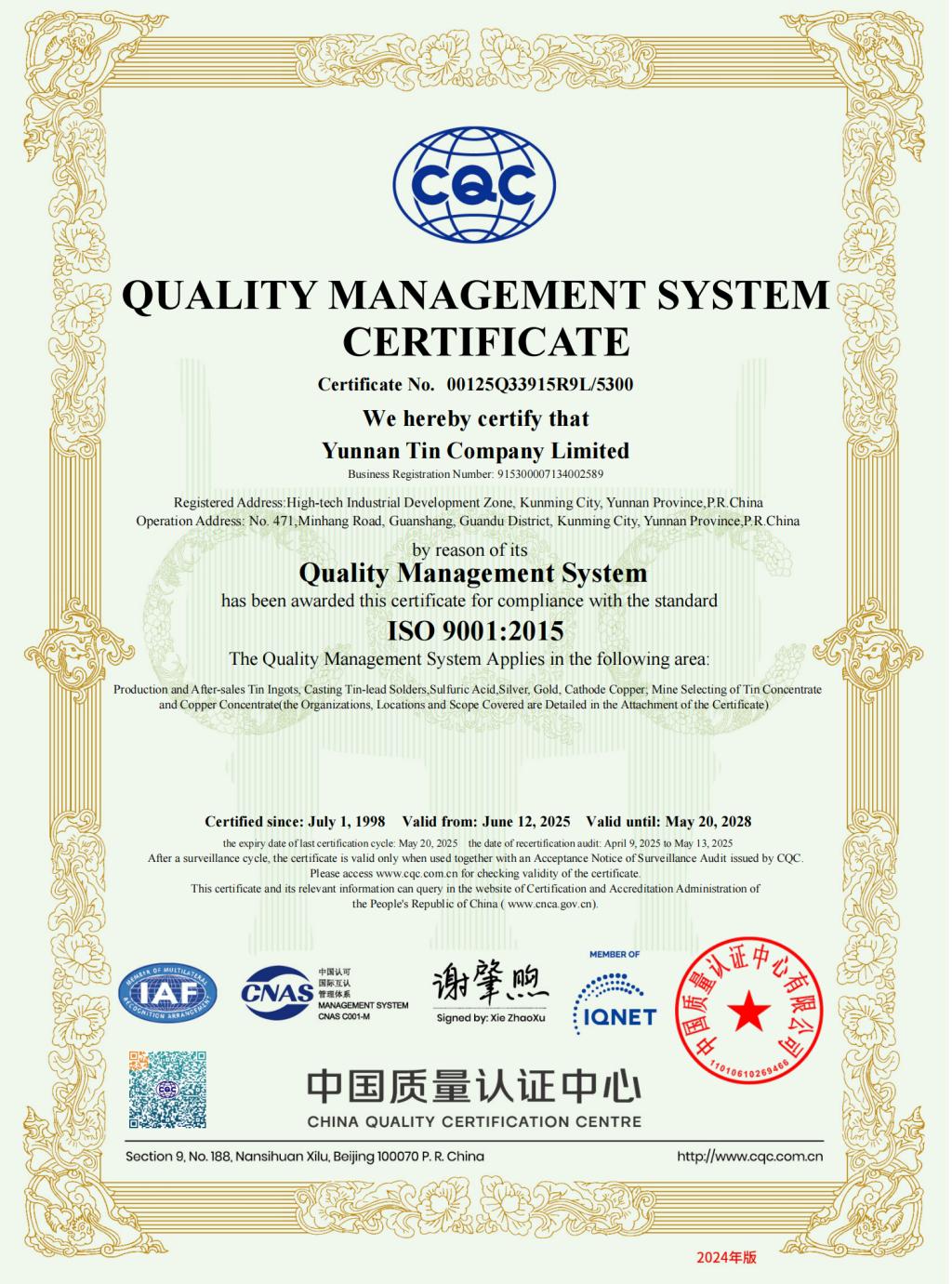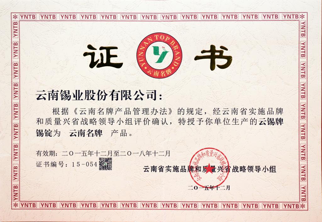 云锡牌锡锭获有色金属实物质量金杯奖