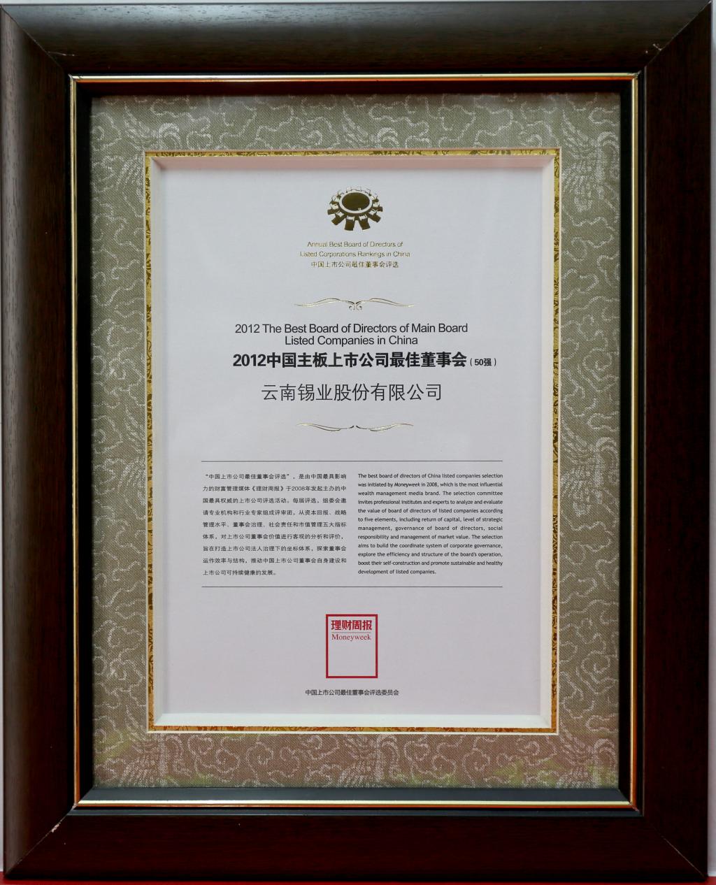 荣获“2012中国主板上市公司最佳董事会”
