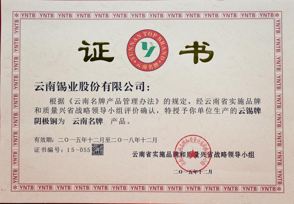 云锡牌阴极铜为云南名牌产品