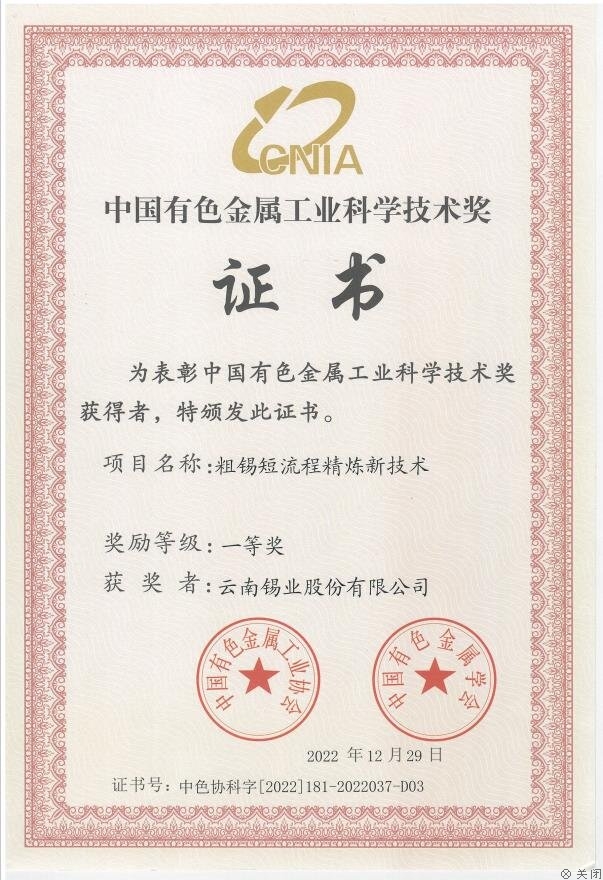 近日,中国有色金属工业协会、中国有色金属学会发布了荣获2022年度中国有色金属工业科学技术奖项目,由云锡控股公司牵头负责,76net必赢官网锡业分公司、昆明理工大学、绿地环保共同参与的“粗锡短流程精炼新技术项目”荣获2022年度“中国有色金属工业科学技术奖一等奖”。