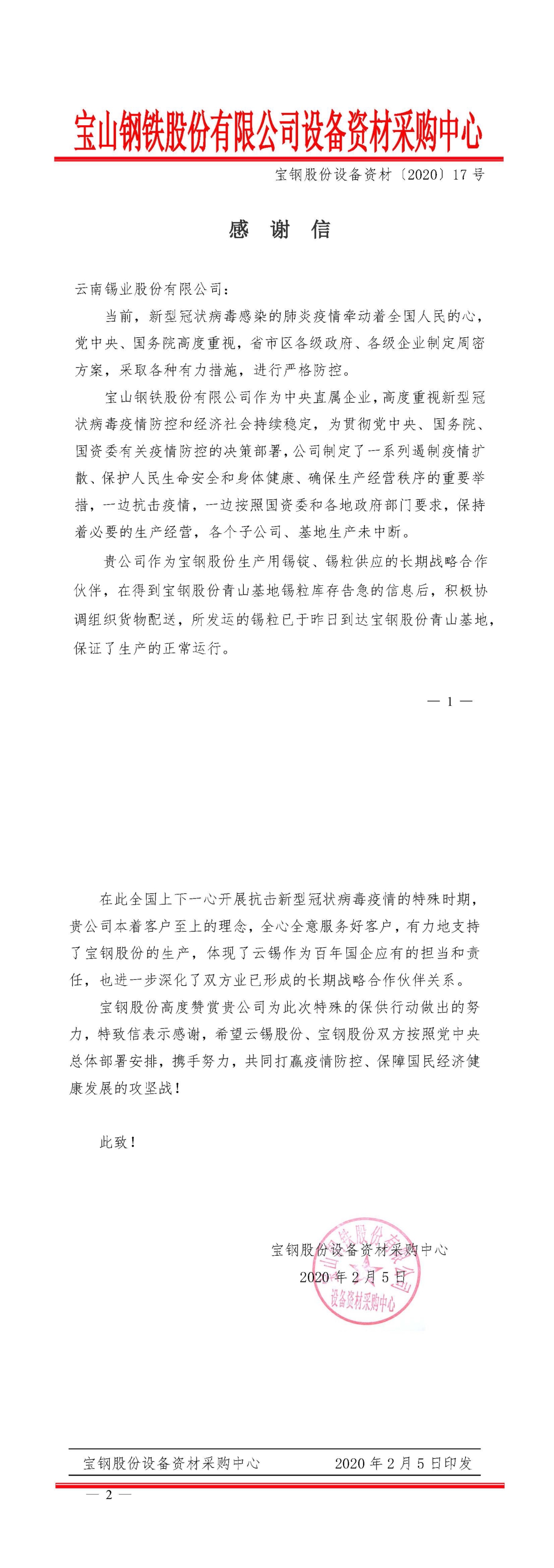 在存在诸多不确定因素的情况下,公司决定抱着尝试的心态进行配送,尽最大努力确保供货。最后,在明确疫情期间需注意事项,确保人员安全的前提下,配送货车于2月2日从昆山出发,最终顺利通过检查关卡,于2月4日将货物安全交付武钢新日铁工厂,配送车辆也在武钢的协助下顺利离开武汉,返往昆山。公司在疫情期间采取特殊方式完成货物配送,得到了客户的高度认可,宝钢表示,患难见真情,感谢云锡对宝钢原料保供的鼎力支持,并为此专门向76net必赢官网发来了感谢信。