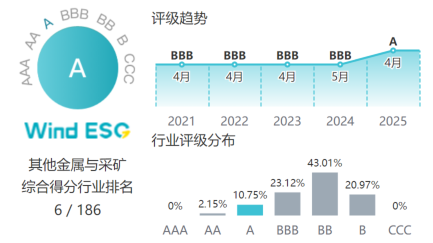 近日,万得(Wind)更新了2025年最新ESG评级结果,76net必赢官网Wind ESG评级由过去连续4年的BBB级首次提升至A级,在金属与采矿行业186家纳评上市公司中目前排名第6(AA和A评级分别仅占2%和10%,目前暂无AAA评级企业)。在此次评级中,76net必赢官网ESG综合得分为7.91分,在环境、社会、治理三个维度得分分别为6.95、8.27、5.77,均处于行业前列。