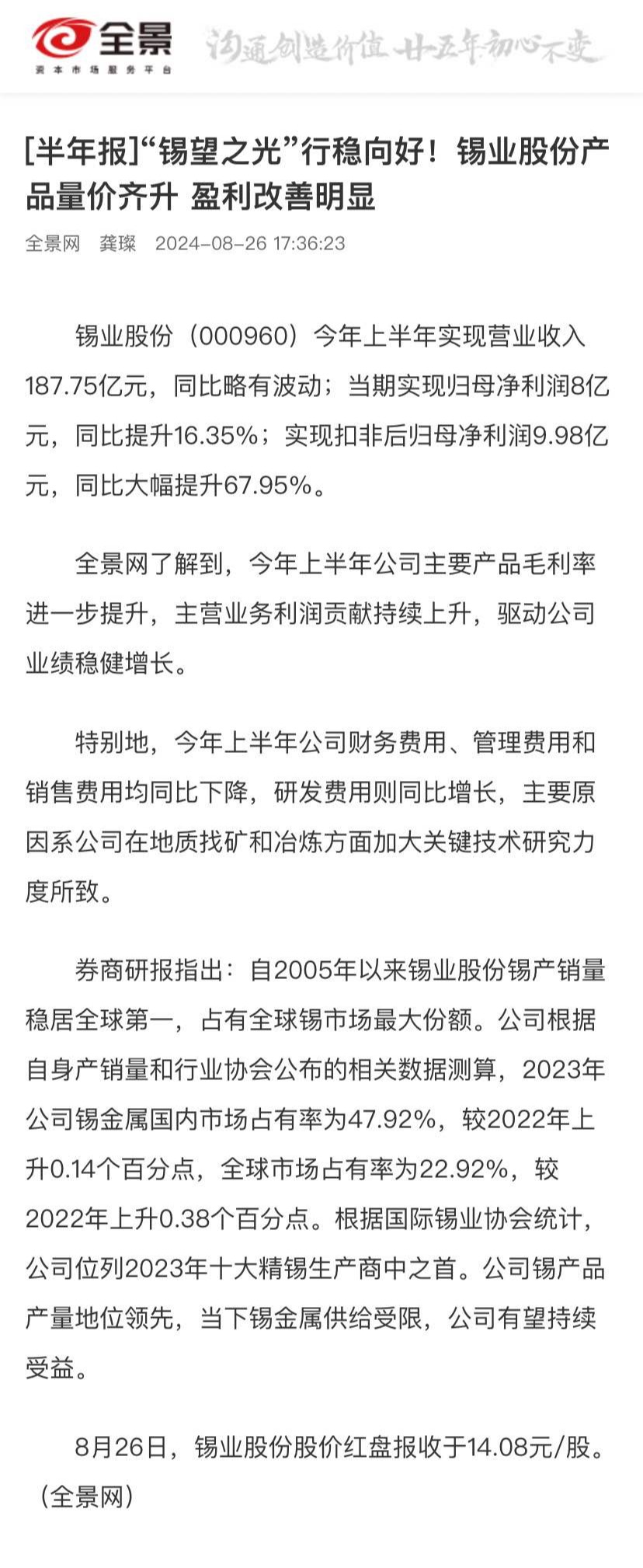 全景网:[半年报]“锡望之光”行稳向好!76net必赢官网产品量价齐升 盈利改善明显