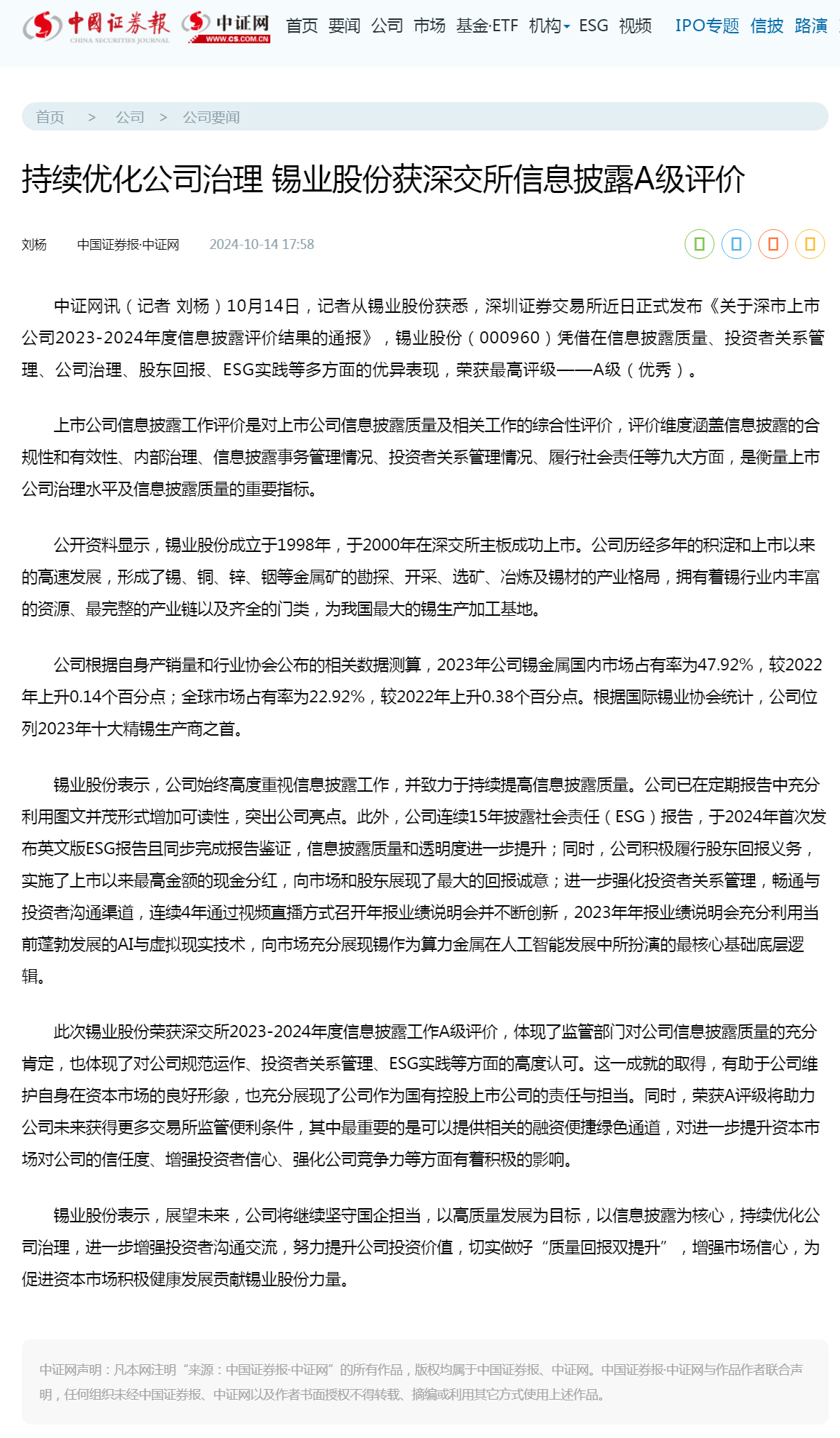中证网:持续优化公司治理 76net必赢官网获深交所信息披露A级评价