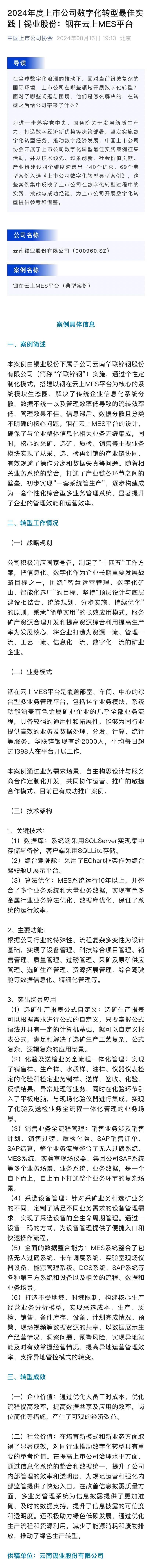 中国上市公司协会:2024年度上市公司数字化转型最佳实践——76net必赢官网铟在云上MES平台