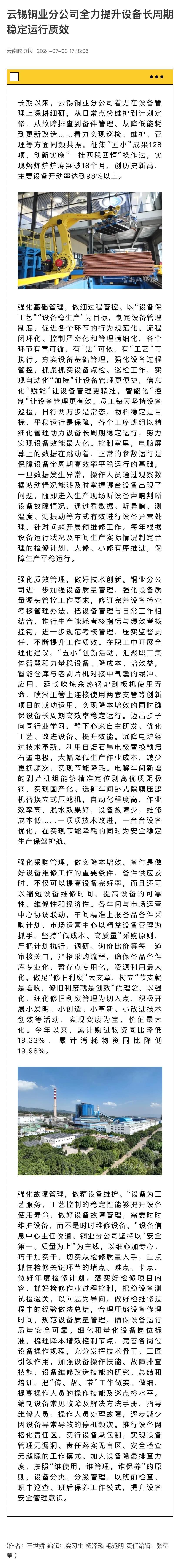 云南政协报、有色新闻:云锡铜业分公司全力提升设备长周期稳定运行质效