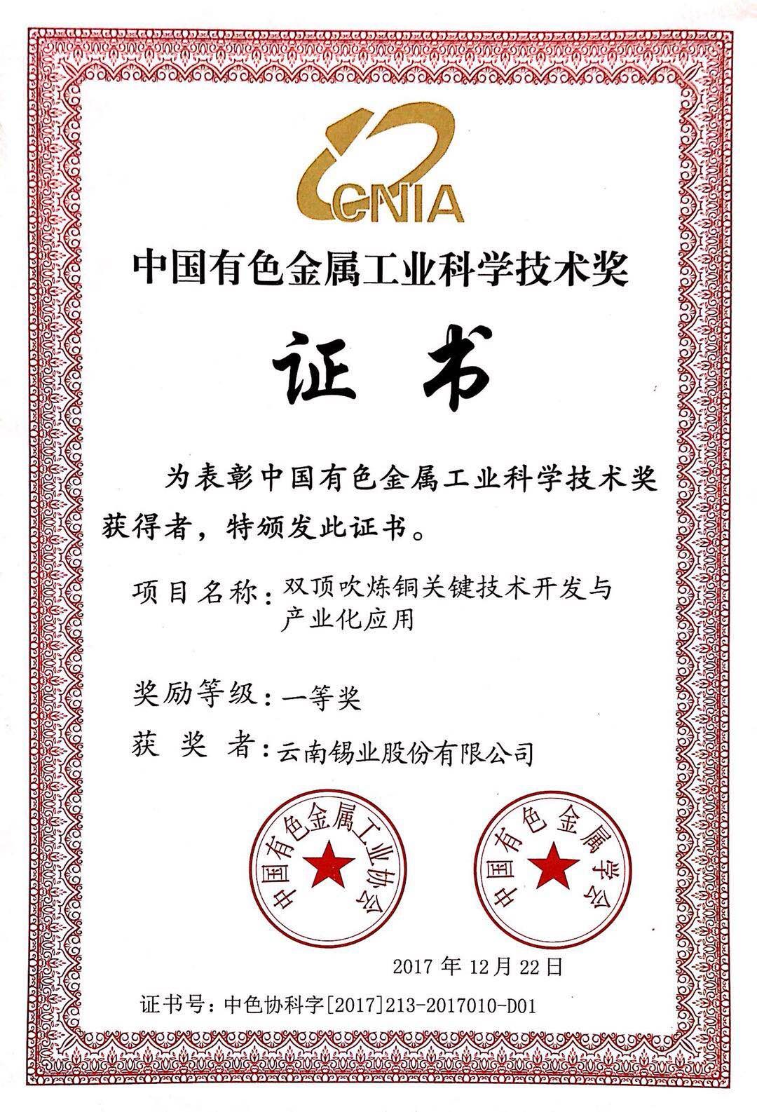 “双顶吹炼铜关键技术开发与产业化应用”荣获中国有色金属工业科技一等奖