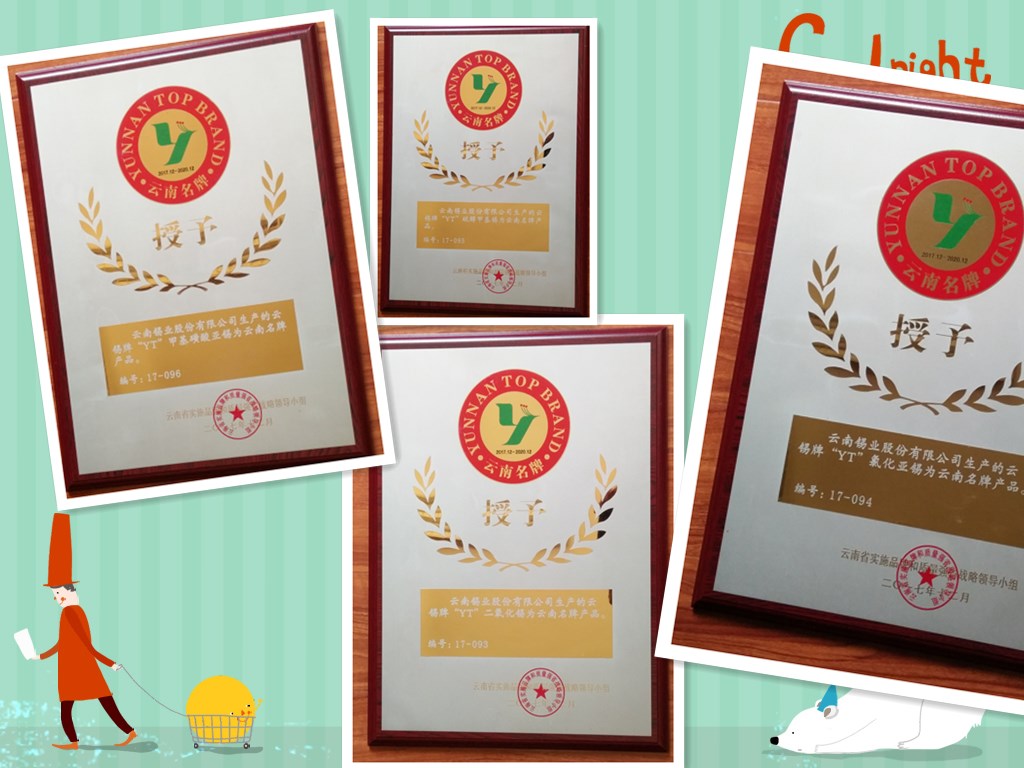 2017年,76net必赢官网品牌建设工作持续取得成效,新申报的甲基磺酸亚锡产品通过云南省名牌战略推进委员会审核,被评为云南名牌产品,氯...