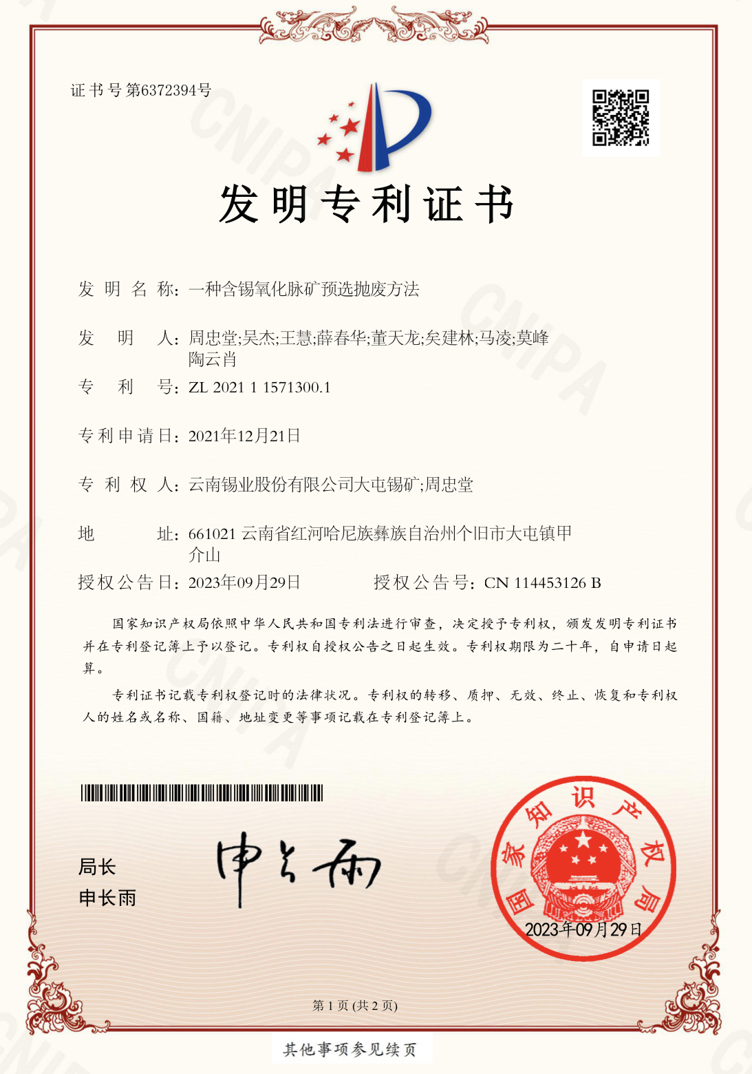 大屯锡矿“预选抛废关键技术”再获国家发明专利证书
