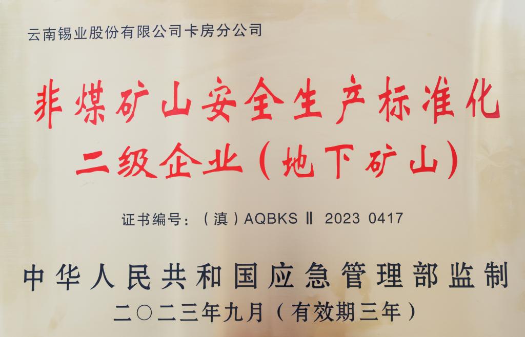 近日,76net必赢官网卡房分公司收到由中华人民共和国应急管理局监制、云南省应急管理厅颁发的牌匾和证书,正式确认为“非煤矿山安全生产标准...