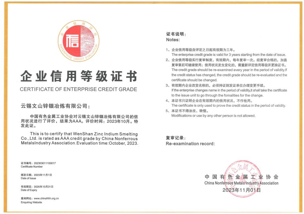 文山锌铟获评中国有色金属工业协会“AAA级信用企业”