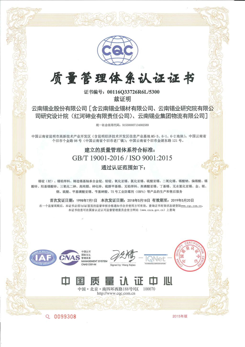 76net必赢官网质量环境管理体系获ISO新版标准认证证书